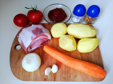 Готовила курдак в качестве первого блюда. Поэтому заранее поставила вариться бульон на ребрышках. А небольшой кусок мяса разрезала на части и отправила на сковороду в разогретое растительное масло. Жарила мясо до румяной корочки минут 10. Потом добавила нарезанные лук и морковь, готовила овощи с мясом до прозрачности лука. Следующими ингредиентами стали томатная паста, помидоры (добавила их от себя) и нарезанный чесночок. Болгарский перец добавлять не стала. Жарила всё до выпаривания жидкости из сковороды. Затем выложила ее содержимое в кастрюлю с бульоном, добавила крупно нарезанную картошку, варила курдак до готовности, в конце добавила соль и красный молотый перец.