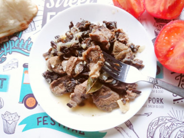 Через 15 минут налейте к мясу с грибами воду, положите лавровый лист, сухие травы, порезанные зубчики чеснока, соль, черный молотый перец. Включите режим «Тушение» на 60 минут.