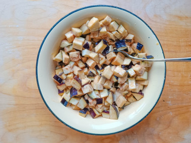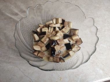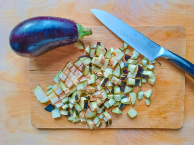 Баклажаны хорошо промойте, обсушите. Отрежьте кончики. Если у плодов толстая шкурка, то можете срезать ее. Это же касается и семян — слишком крупные лучше вырезать. Нарежьте баклажаны средними кубиками.