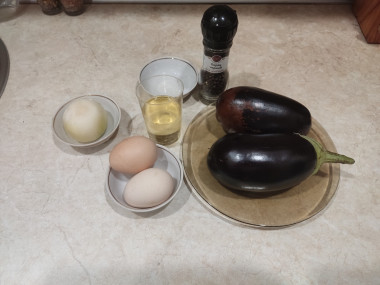 Баклажаны порезала средними кубиками. Яйца разбила в миску и взбила вилкой. Добавила баклажаны в яйца,перемешала и оставила на час мариноваться. Лук порезала небольшими кубиками. В сковороде разогрела масло растительное, выложила лук, баклажаны и обжарила до готовности. В конце приготовления добавила соль и перец.