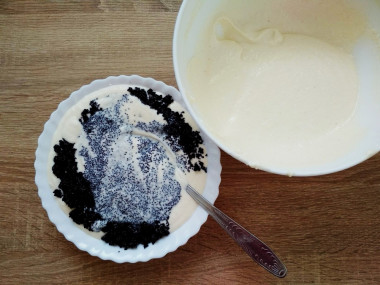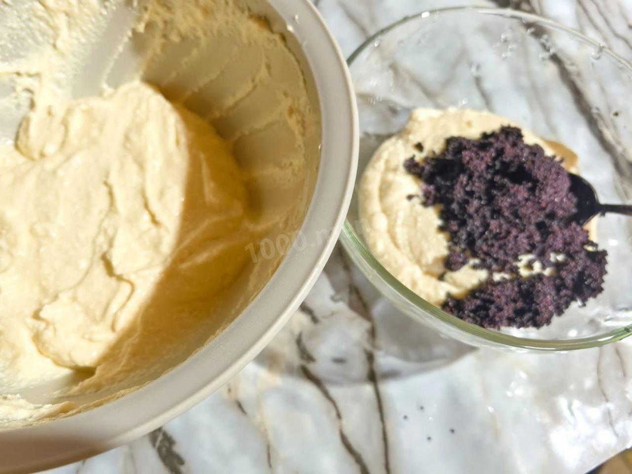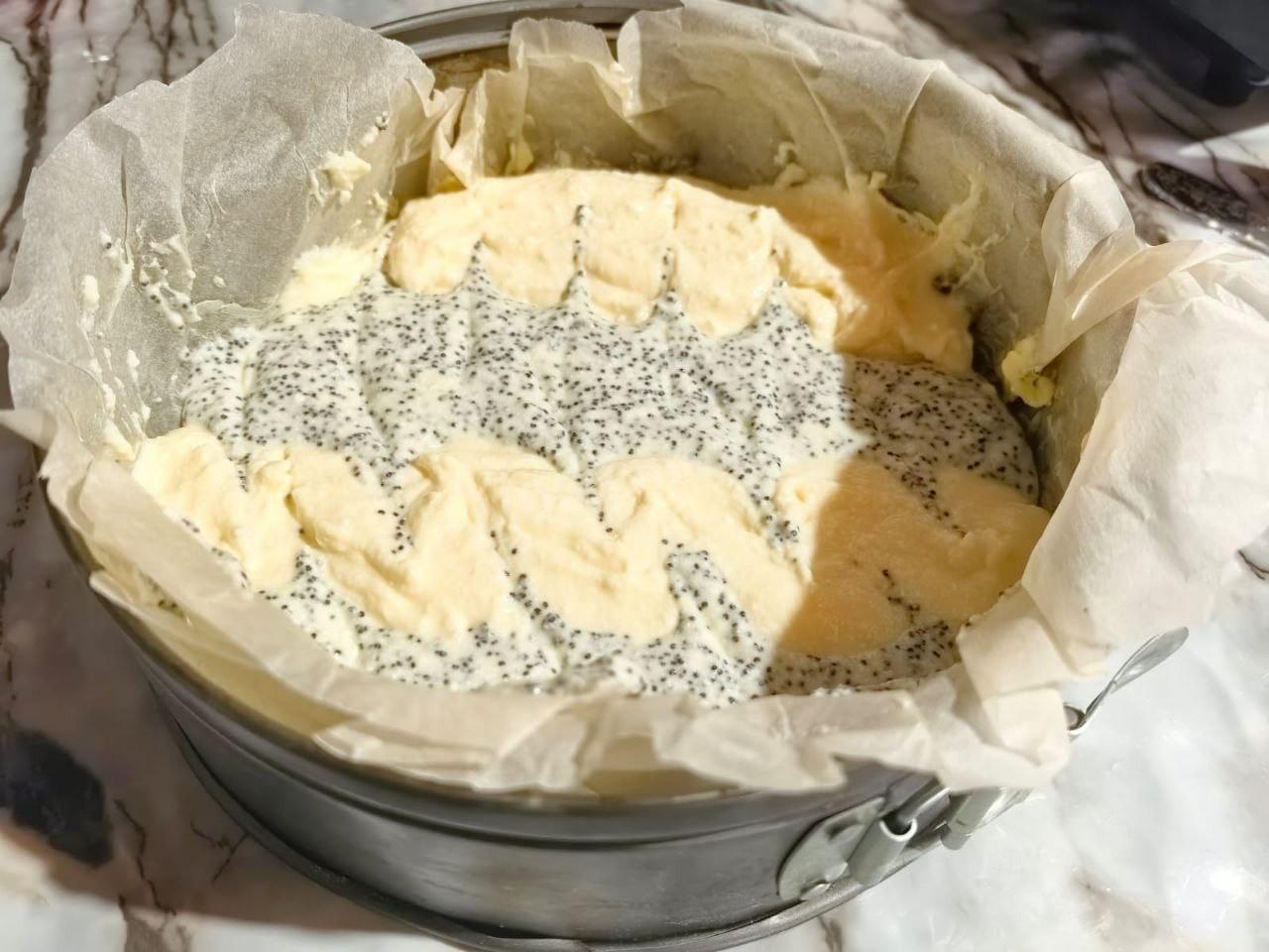 Через указанное время разделите творожную массу на две части. В одну часть добавьте мак. Тщательно перемешайте. Подготовьте форму для запекания. Застелите её бумагой для выпечки, смажьте дно и бока сливочным маслом. С выбором формы для запекания и пергамента помогут статьи по ссылкам в конце рецепта.