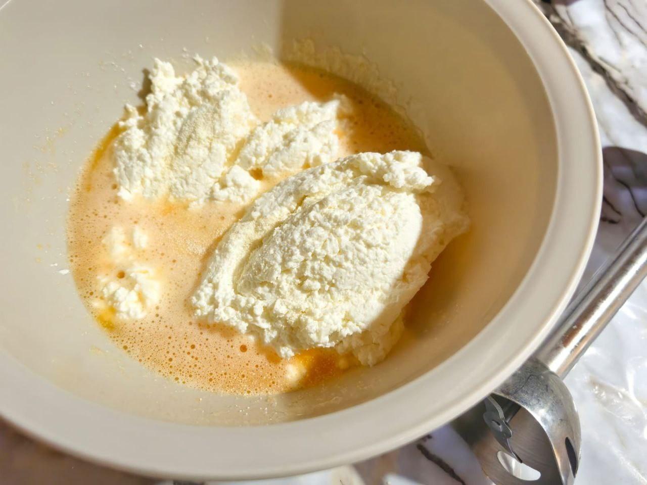 К яичной массе добавьте творог. Перемешайте всё блендером до получения однородной массы.