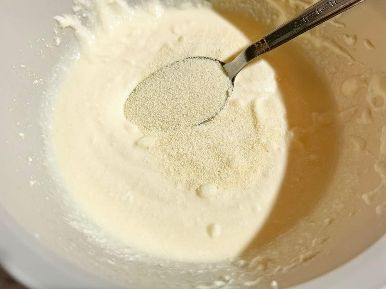 К полученной массе добавьте манку. Перемешайте всё. Дайте массе настояться 15-20 минут, чтобы манка успела набухнуть. Об особенностях выбора манки и её приготовления читайте в конце рецепта. Включите духовку на 180 градусов.