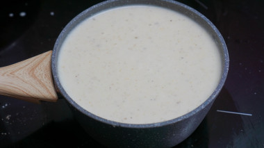 При постоянном помешивании влейте к ней тонкой струйкой молоко. Чтобы разбить все комочки удобнее взять венчик. Добейтесь полной однородности соуса.