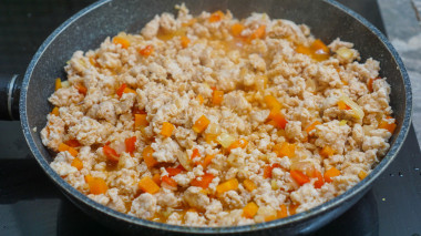 Выложите на сковороду фарш. Разбивая крупные комки дождитесь изменения цвета с красного на серый.