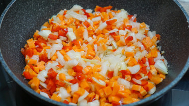 Разогрейте на среднем огне сковороду, налейте на нее растительное масло для жарки. Выложите лук и чеснок. Обжарьте их, помешивая, до прозрачности, 2-3 минуты.