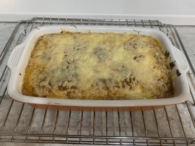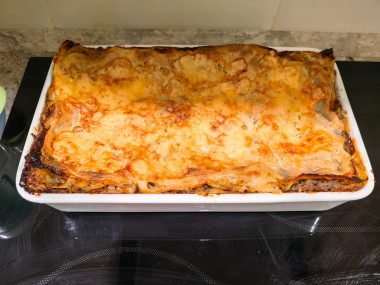 Далее перешла к сборке лазаньи в жаропрочной стеклянной форме. Выкладывая слоями - листы лазаньи, фарш с соусом болоньезе, соус бешамель и тертый сыр. У меня в итоге получилось три слоя листов лазаньи, и два - из фарша. Собранную лазанью отправила выпекаться в духовку на 45 минут при 180 градусах.