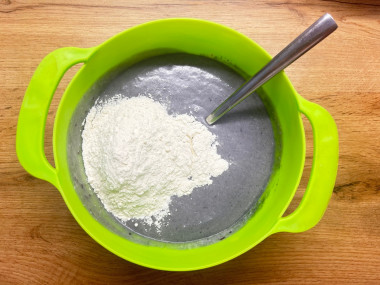 Возьмите муку, просейте ее через сито или с помощью специальной кружки. Это насытит муку кислородом и сделает выпечку воздушной. Добавьте в несколько этапов муку к остальной массе, перемешайте все миксером. Должно получиться гладкое тягучее тесто, немного похожее на тесто для оладушек. Муки может понадобиться больше.