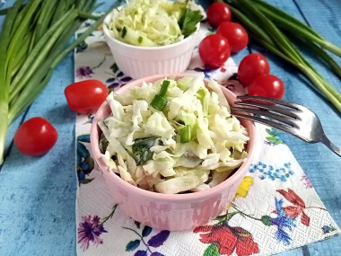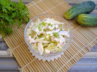 Салат из капусты и огурца с майонезом на скорую руку. Не требует много времени для подготовки продуктов. Очень люблю этот салатик. так как он занимает немного времени для приготовления и получается очень сытным. Спасибо за рецепт.