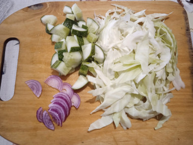 Небольшой кочан капусты я нарезала тонкой лапшой и помяла ее с солью. Капуста и так сочная, но хотелось, чтобы она стала помягче.