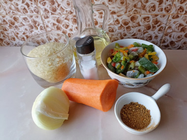 Калорийность продуктов: Рис, Морковь, Лук, Болгарский перец, Вода, Растительное масло, Специи сухие, Соль, Зелень
