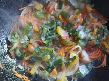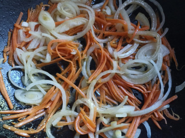 На сковородке разогрейте растительное масло, положите морковь, обжарьте слегка. Затем положите к моркови лук и обжаривайте, помешивая, до мягкости лука. Добавьте сладкий болгарский перец. Обжаривайте овощи на среднем огне 5-7 минут. Всыпьте пряности и специи по вкусу. О том, как подобрать идеальную сковороду, а также как правильно выбрать растительное масло, читайте в отдельных статьях, ссылки в конце рецепта.