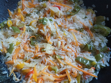 Приготовила на второе рис перец морковь лук. Рис взяла длиннозерный, болгарский перец у меня замороженный. В глубокой сковороде обжарила со специями морковь, лук, перец, добавила промытый рис, воду, посолила по вкусу. Готовила на слабом огне под крышкой до готовности риса. Вкусно и как самостоятельное блюдо и как аппетитный гарнир. Спасибо автору за рецепт!