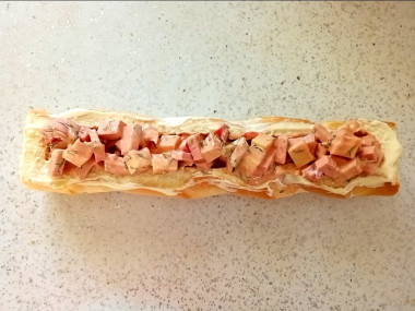 У батона срежьте верхушку, мякоть аккуратно вырежьте, чтобы получилось подобие лодочки. Мякиш и крышку пустите на панировочные сухари.