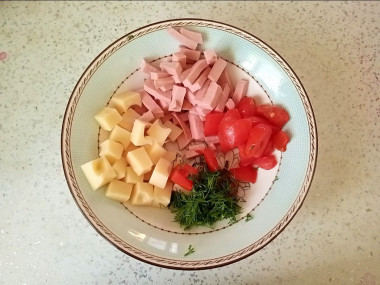 Помидор помойте, обсушите и также нарежьте кубиками. Сильно не мельчите, пусть кусочки будут крупными. Помидоры выбирайте сочные, но плотные. Мягкие плоды плохо держат форму, в процессе нарезки и приготовления они расползутся в бесформенную массу и испортят внешний вид блюда.