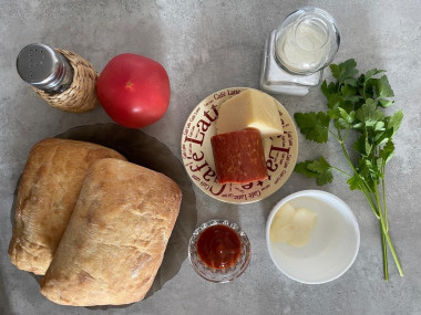 Как запечь батон с начинкой в духовке? Подготовьте продукты. Для рецепта подойдет как обычный батон, так и небольшой багет, буханка, булочка или чиабатта, как у меня. То же касается и наполнения, берите все, что есть — колбасы, грибы, помидоры, лук, соленые огурцы, оливки, перец.