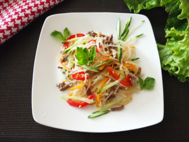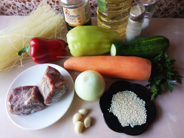 Как сделать фунчозу с овощами? Подготовьте все указанные продукты. Мясо можно использовать любое: свинину, курицу или говядину. В этот раз мы будем готовить салат с говядиной. Выберите мякоть без прожилок и плёнок. Набор овощей возьмите по своим вкусовым предпочтениям. Для яркости салата я использовала болгарские перцы разных цветов.