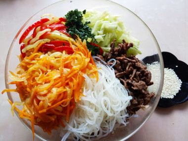 Стеклянную лапшу отварите согласно инструкции на упаковке (обычно не более 5 минут). Откиньте фунчозу на дуршлаг и дождитесь когда она остынет. О тон4остях выбора и приготовления разных видов макаронных изделий читайте в отдельной статье в конце этого рецепта.
