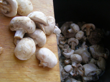 Когда курица обжарится выложите её на тарелку. А в чашу мультиварки выложите нарезанные шампиньоны. Обжарьте их 5-7 минут. Затем добавьте к грибам нарезанный лук. Обжаривайте все вместе еще 3-4 минуты.