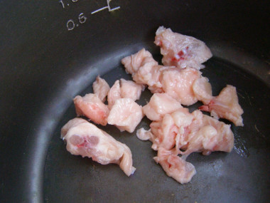 Куриное филе ополосните в проточной воде, обсушите от лишней влаги и нарежьте крупными кусочками. Чашу мультиварки разогрейте до горячего состояния на режиме "жарка", налейте немного растительного масла и выложите нарезанную курицу. Обжаривайте её 7-8 минут до золотистого цвета.