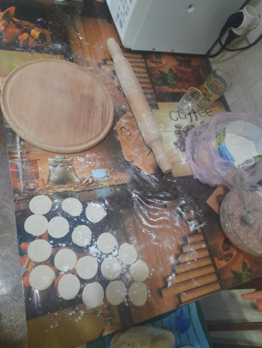 Вылежавшееся тесто раскатайте при помощью скалки в тонкий пласт. С помощью стакана вырежьте из теста кружочки. Остатки теста снова хорошо вымесите и заново раскатайте.