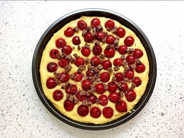 Форма у меня с низкими бортиками, ширина 22 см, смазала ее растительным маслом. Поверх теста разложила вишни и посыпала чайной ложкой сахара. Под рукой был молочный шоколад, решила порубить три квадратика и посыпала сверху. Выпекала пирог 35 минут при 180°С. Из формы он вышел без проблем.