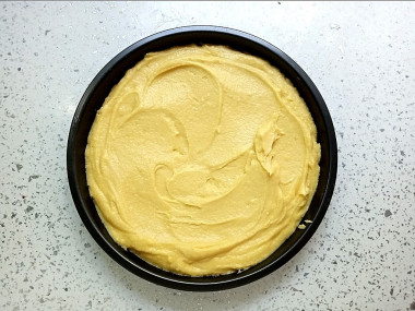 Возьмите жаропрочную форму для запекания с высокими бортиками (диаметр 25*25 см). Застелите ее пергаментом. Выложите в нее тесто для простого, вкуснейшего пирога и разровняйте его поверхность кулинарной силиконовой кисточкой.