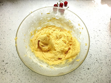 Взбейте тесто для пирога с замороженной вишней в духовке миксером. Оно должно получиться достаточно вязким, однородным.