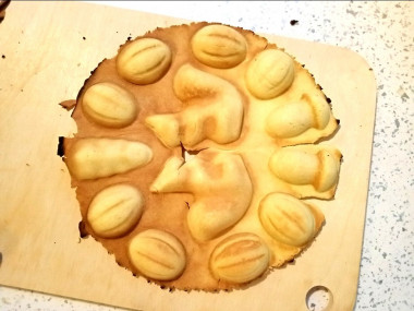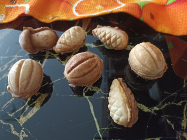 Выкладываем в углубления формы наши заготовки из теста, придавливаем крышкой и жарим около 5 минут. Проверяем готовность «скорлупок» орешков – они должны быть румяными.