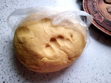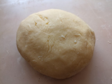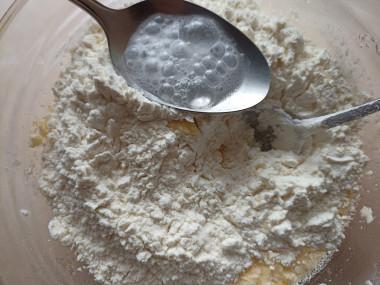Всыпаем просеянную муку, добавляем соль и соду, гашенную уксусом. Вымешиваем мягкое эластичное тесто, делать это нужно очень быстро, а подсыпать для подмеса нужно совсем немного муки, чтобы тесто не получилось тугим. Заворачиваем тесто в пищевую пленку и даем ему отдохнуть примерно час в холодильнике.