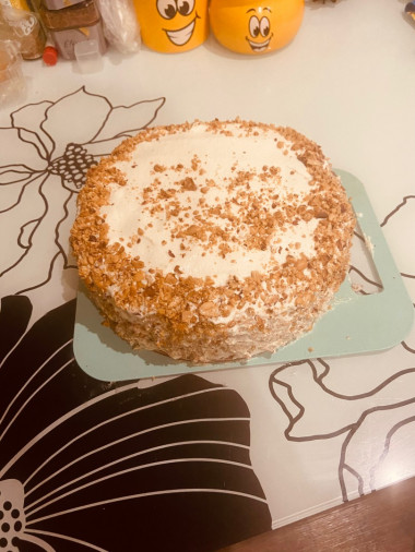 Бока обсыпьте жареными рублеными орехами. Уберите торт в холодильник на ночь для пропитки.