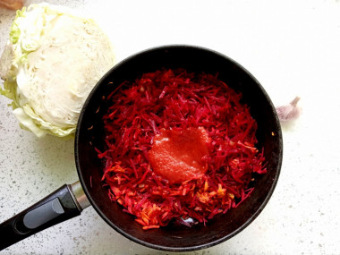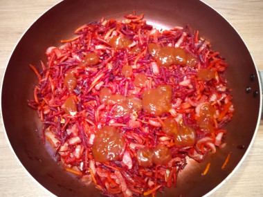 В сковородке разогрейте растительно масло без запаха. На сильном пламени обжарьте лук, свёклу и морковку около 5 минут, постоянно помешивая. Добавьте томатный соус.