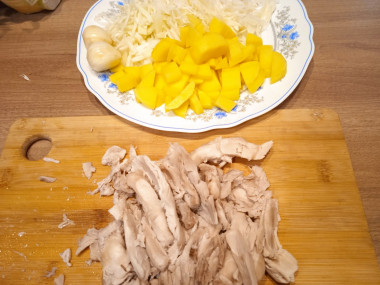 С окорочков снимите кожу. Нарежьте курицу небольшими кусочками, как на фото.