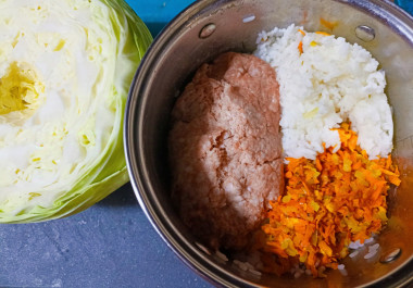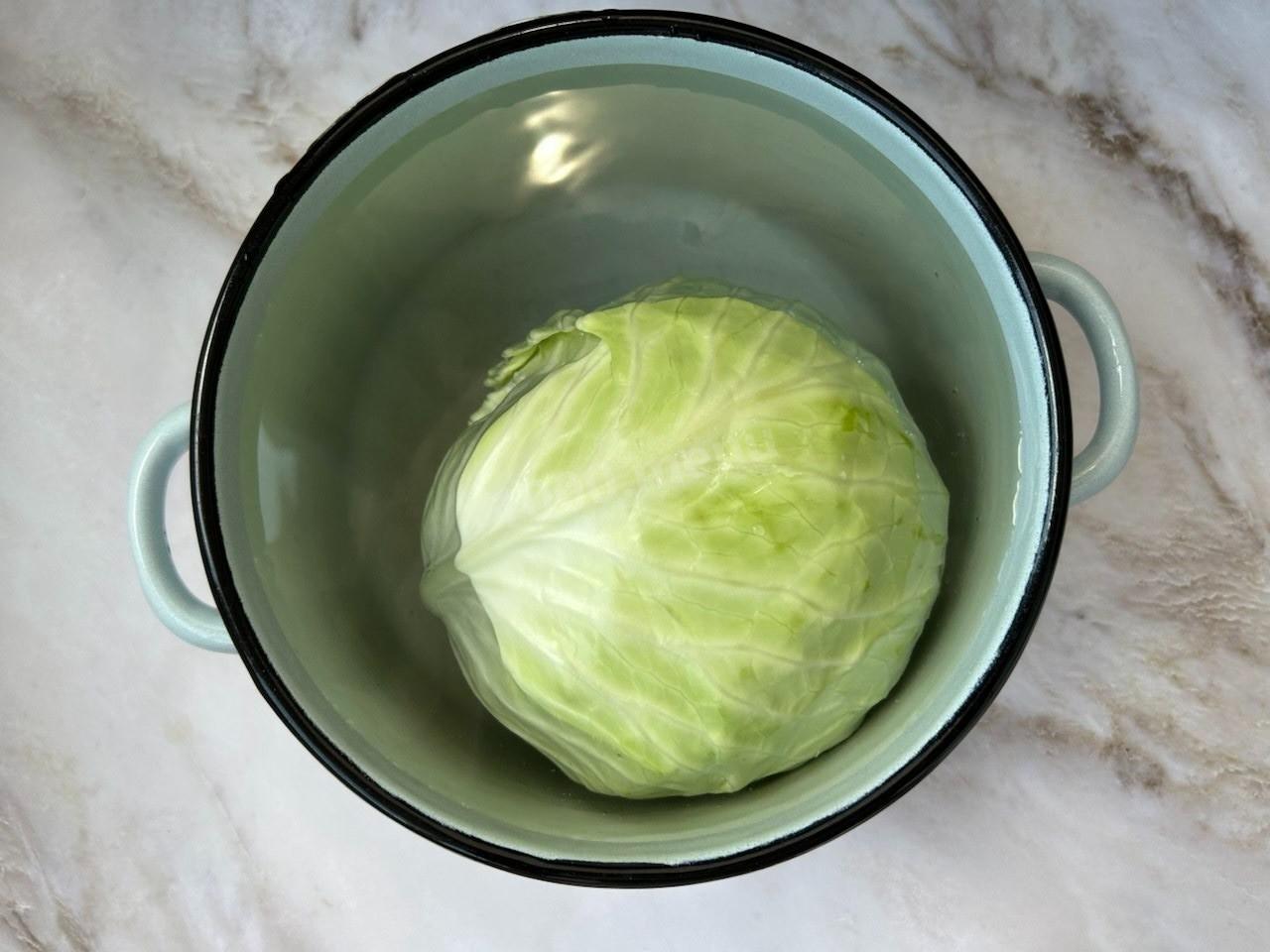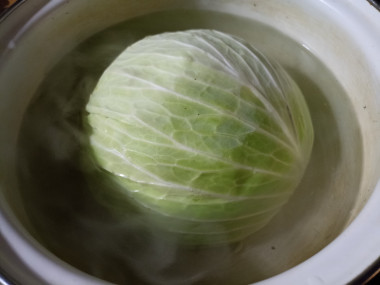 Вырежьте у кочана капусты кочерыжку так, чтобы листья можно было легко отделять. Погрузите капусту в кастрюлю с водой, дайте закипеть и варите на медленном огне до легкой прозрачности и мягкости, отделяя по одному листу.