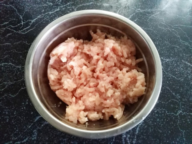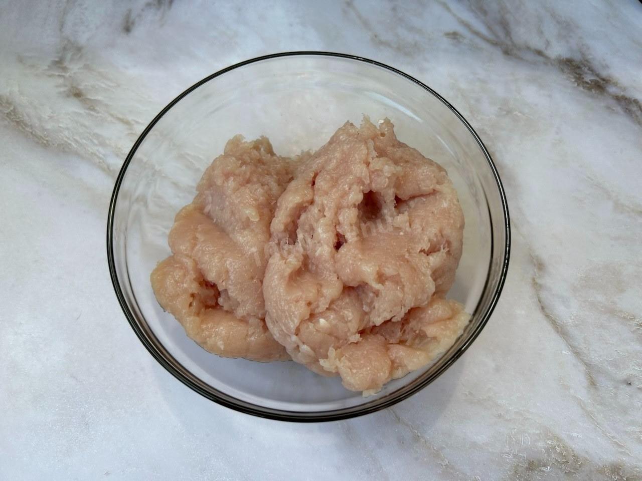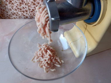 Куриное мясо пропустите через мясорубку или измельчите в блендере.