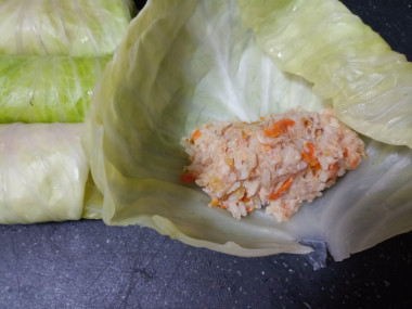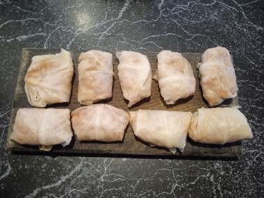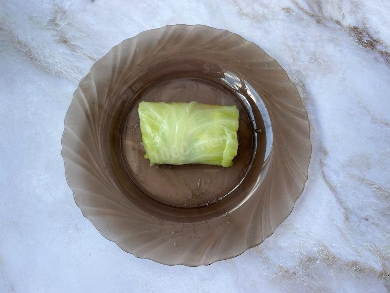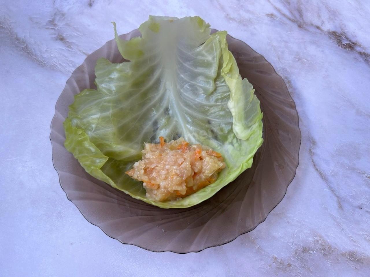 Заверните по 1-2 столовой ложке массы в подготовленные капустные листья.