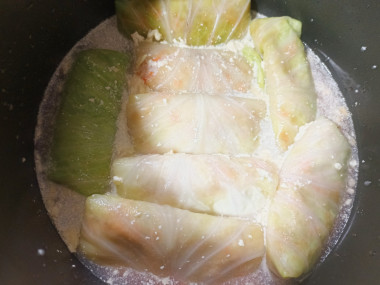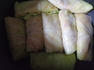 Сформируйте голубцы из всего фарша. Сложите в кастрюлю, положив на дно несколько капустных листьев.