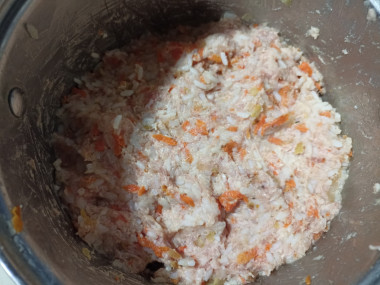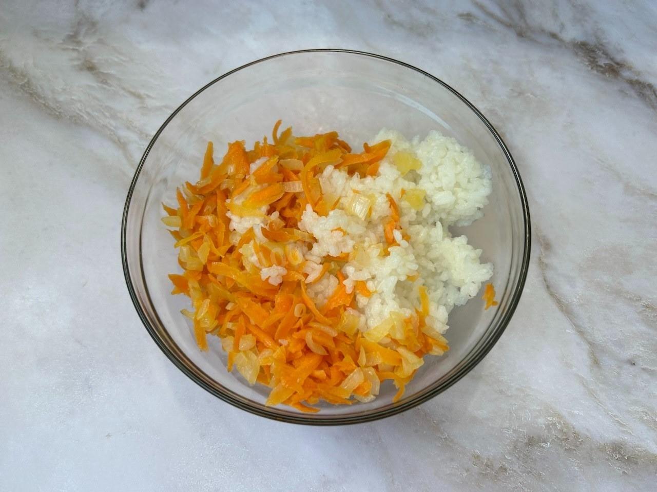 Смешайте обжаренные овощи с отварным рисом и дайте остыть.