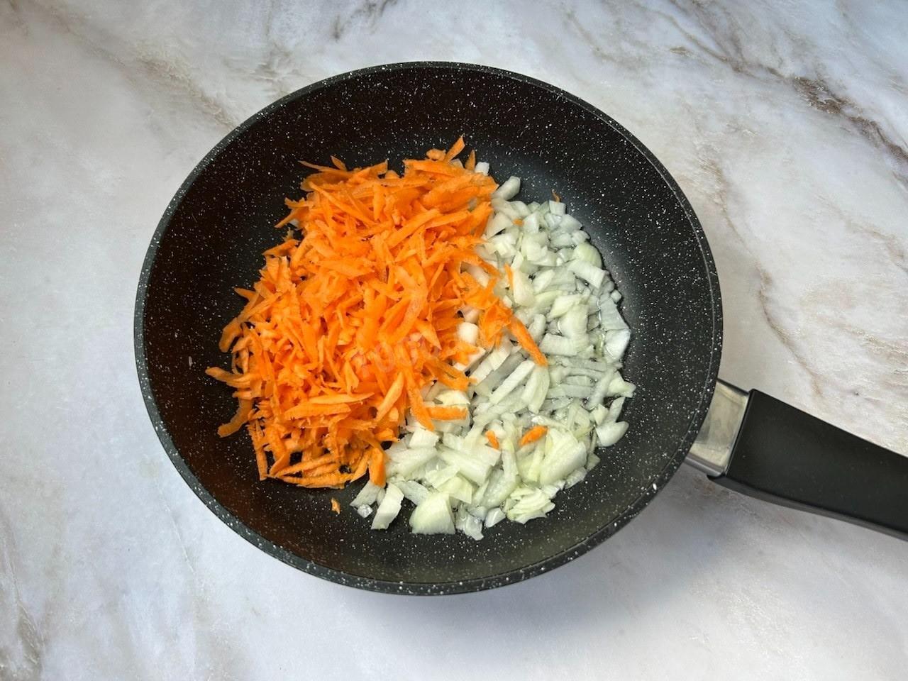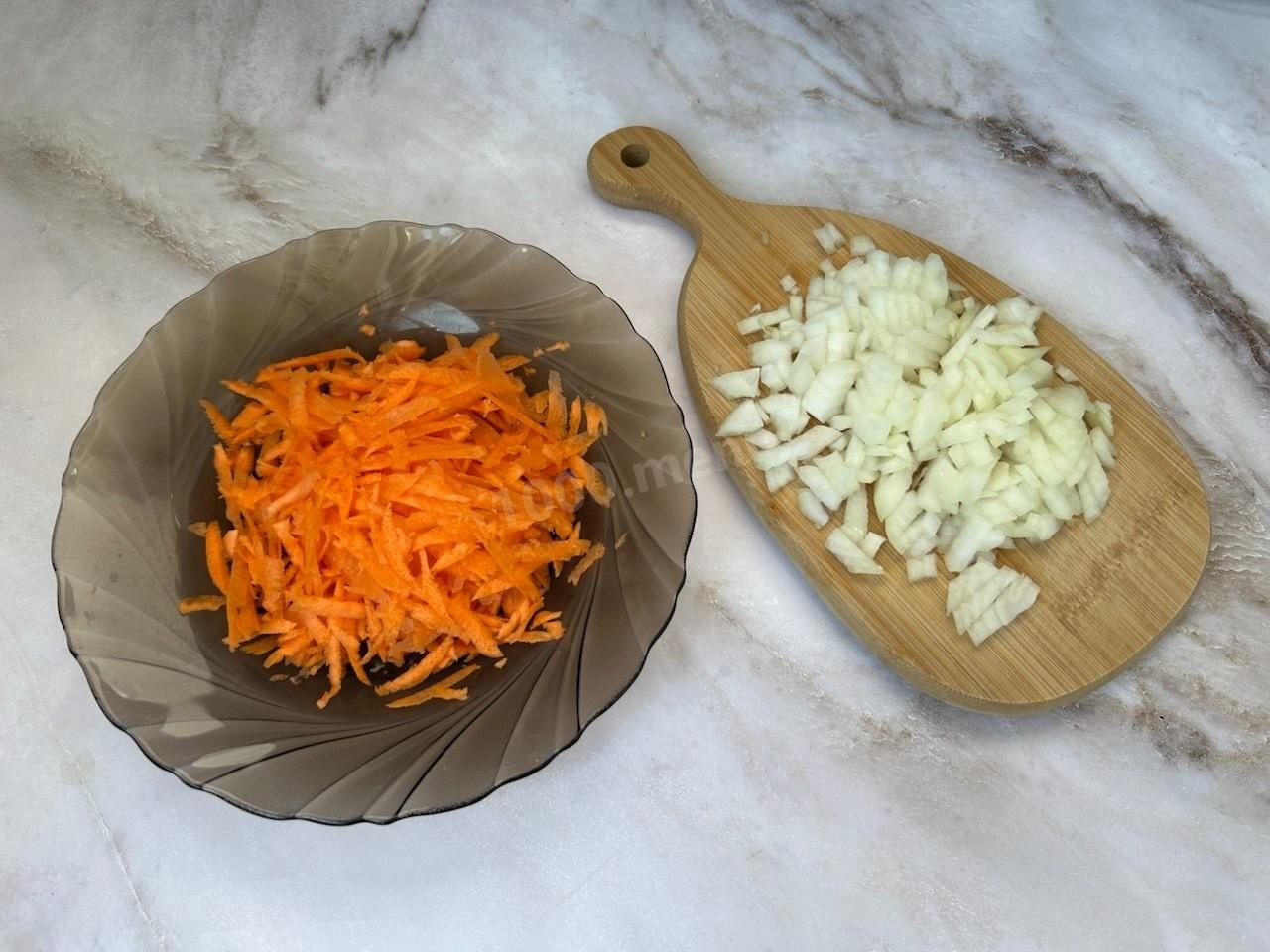Лук нарежьте мелкими кубиками, морковь натрите на терке.