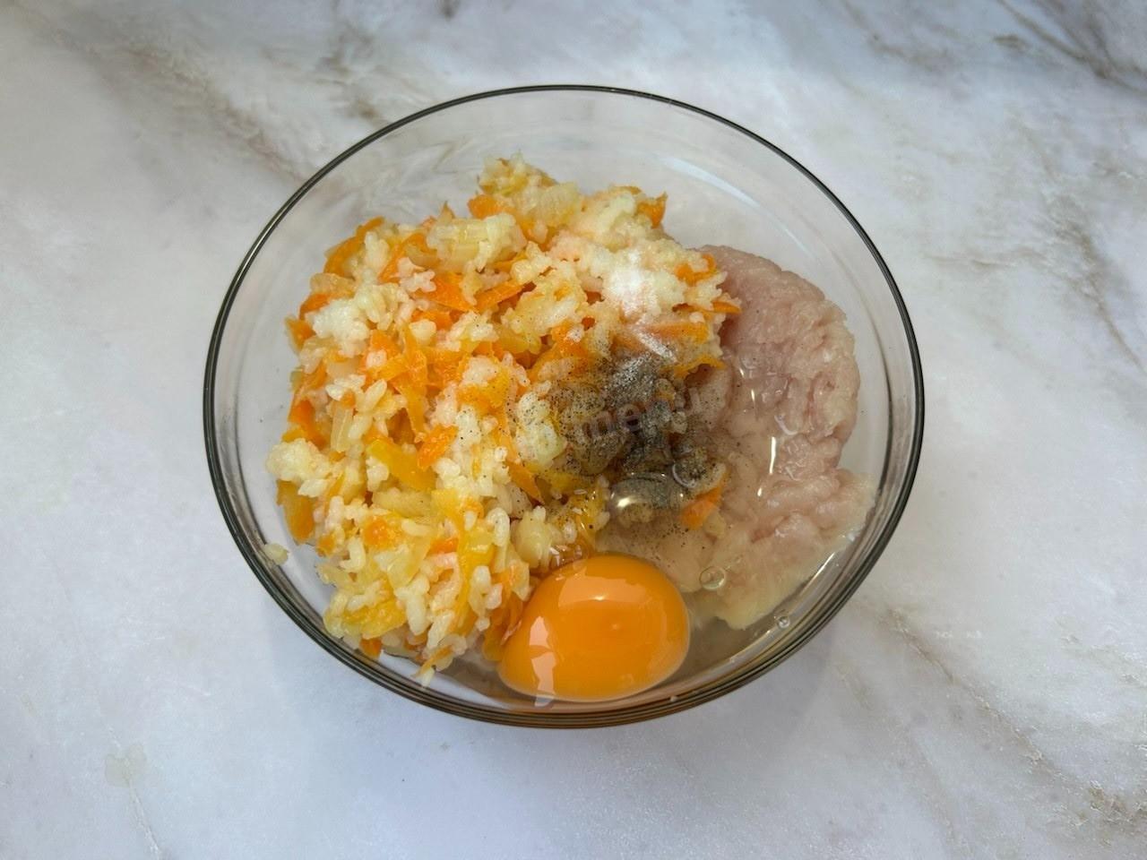 Соедините куриный фарш с овощами, добавьте яйцо, посолите и добавьте черный молотый перец по вкусу. Массу тщательно перемешайте.