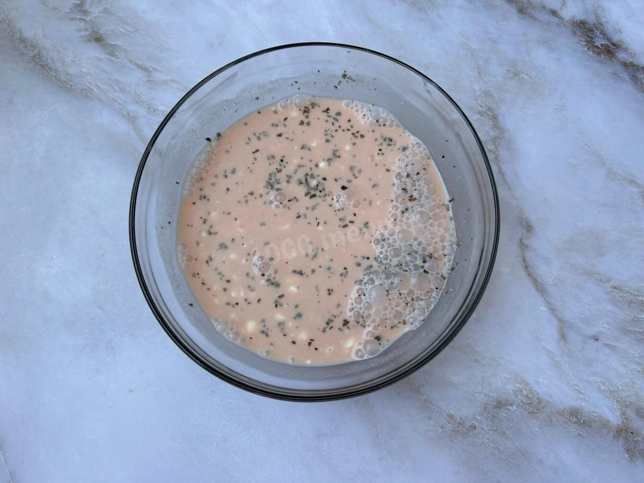 Смешайте сметану с томатным соком, добавьте в соус соль по вкусу и сушеный базилик.