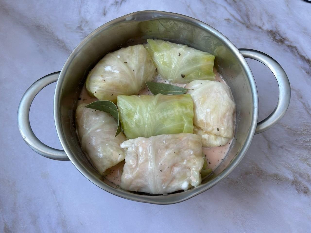 Залейте голубцы. Добавьте немного воды так, чтоб соус практически полностью покрывал голубцы. Положите лавровый лист. Поставьте вариться, накрыв крышкой. Готовьте голубцы из куриного фарша на медленном огне примерно 30 минут с момента закипания.