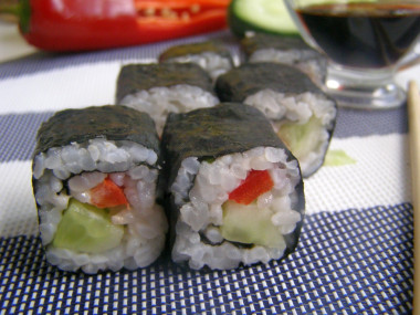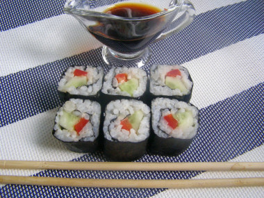 Такие роллы с огурцом, которые можно и каждый день готовить, и праздничные вариации устраивать, подаются с васаби, имбирем, соевым соусом и, конечно же, с палочками. Я добавила еще болгарский перец. Спасибо за идею. Вообще не обязательно делать роллы постными.