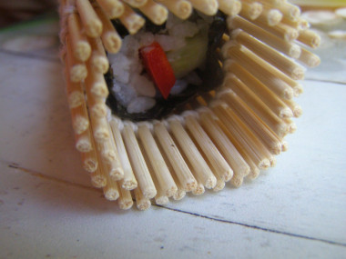 Аккуратно, помогая ковриком-циновкой начните сворачивать ролл.
