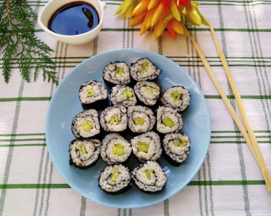 Все, роллы постные с огурцом готовы, можно подавать к столу. Сроллами подают соус васаби, маринованный имбирь и соевый соус. Приятного аппетита!