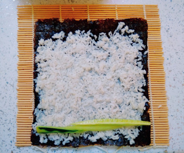 Расстелите лист нори на коврике-циновке, смачивая руки в уксусном растворе, для этого в мисочке с водой размешайте чайную ложку уксуса. Равномерно распределите рис по поверхности Оставьте пустым пространство в 1,5 см у края водоросли.