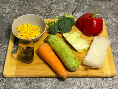 Калорийность продуктов: Цукини, Морковь, Болгарский перец, Капуста краснокочанная, Кукуруза консервированая, Брокколи, Рисовая лапша, Кунжут, Оливковое масло, Соус чили, Соевый соус, Лимоны