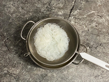 Далее плиту выключите, отправьте к брокколи фунчозу и оставьте таким образом до тех пор, пока лапша не дойдёт до готовности. Обычно на это уходит не более 3-5 минут, посмотрите на упаковке. Откиньте лапшу и брокколи на дуршлаг.
