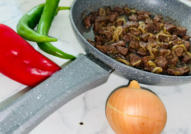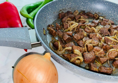 Жареная говядина на сковороде -вкуснейшее , аппетитное блюдо. Мясо порезала небольшими кубиками, лук порезала полукольцами. На сковороде обжарила мясо,добавила лук, соль, перец, обжарила всё вместе. Далее добавила воду и протушила до готовности.