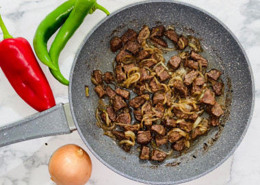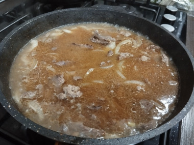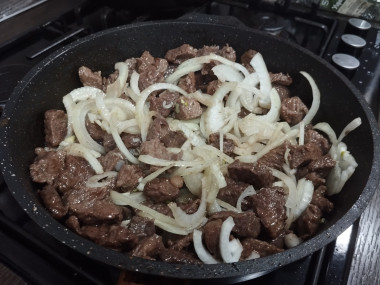 Когда говядина зарумянится, выложите в сковороду нарзанный лук и перемешайте. Обжаривайте всё вместе еще около 5 минут до прозрачности лука. За это время подогрейте воду до горячего состояния.